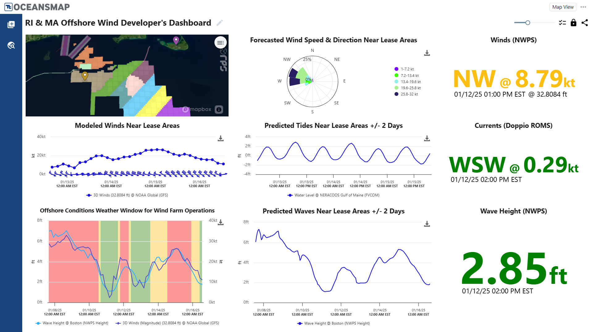 The OceansMap insights dashboard is a fully customizable presentation scape that can adapt to a user’s operational needs. Multiple dashboards can be created, saved, and shared by users to provide situational awareness at key locations and assets. Using a dashboard to present complex met-ocean data offers numerous benefits. The dashboard provides a consolidated view of essential metocean parameters and enables decision-makers to quickly assess the current conditions, identify trends, and understand the impact on their operations.