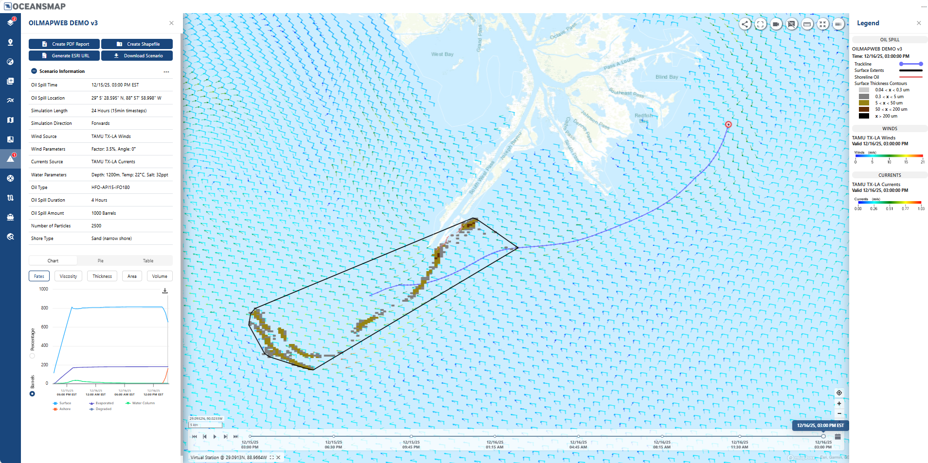 OILMAPWeb is a tool developed in the OceansMap framework that leverages our industry leading computational models and enables users to run and visualize oil spill trajectory and fate models. These tools provide operators with rapid trajectory outputs to aid response and improve outcomes.